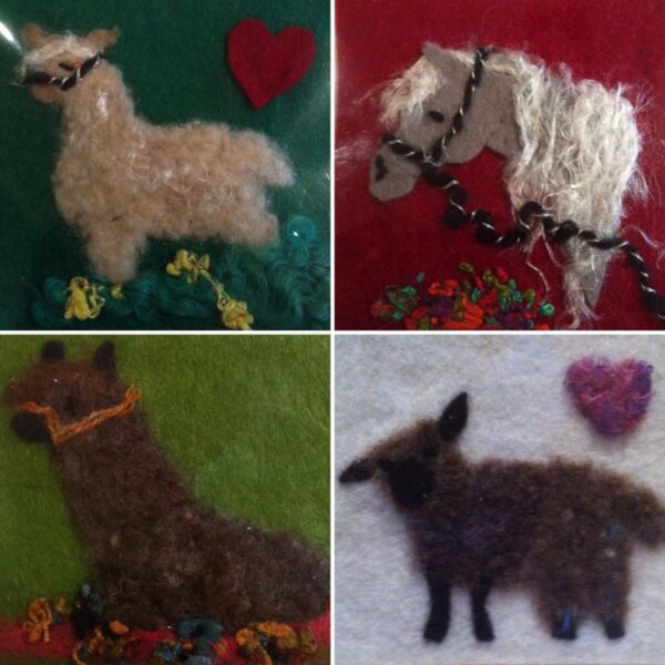 Each is made by me by hand using dry needle felting techniques. It was a pastime that started off with me doing some of our sheep which are coloured Rylands who look like big teddy bears and were really cute as lambs. I then started creating Alpacas as I just love them. From there I experimented with donkeys, ponies and dogs. They make cute gifts for children and adults alike.